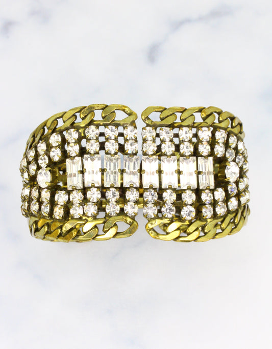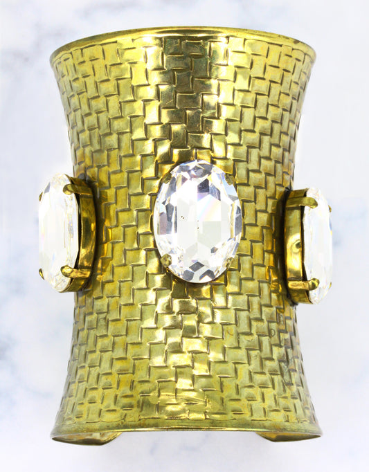 The Vintage Lara Cuff is a one-of-a-kind statement piece that is sure to turn heads. This brass cuff is handcrafted with genuine baguette and rectangular crystals that add a touch of luxury. This cuff is the perfect accessory to take your outfit from day to night. Size: 7.5cm x 4.8cm x...